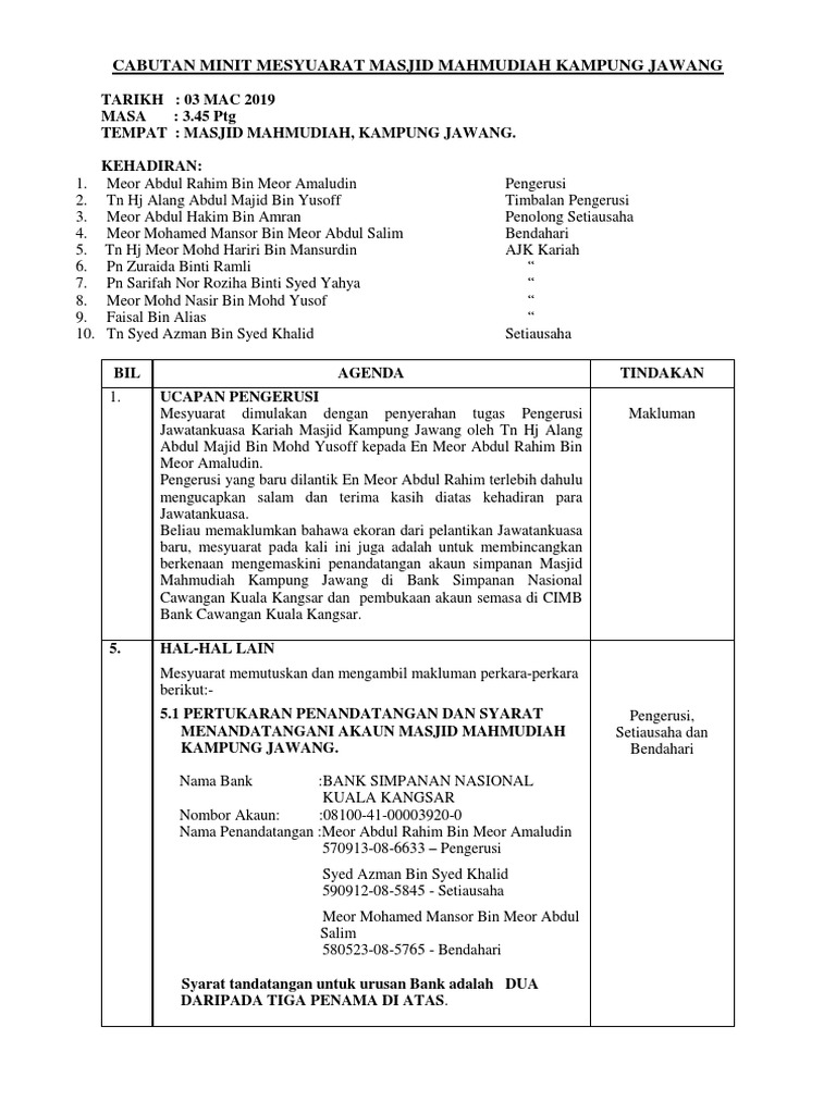 Minit Mesyuarat Tukar Tandatangan Dan Buka Akaun Semasa Masjid Mahmudiah